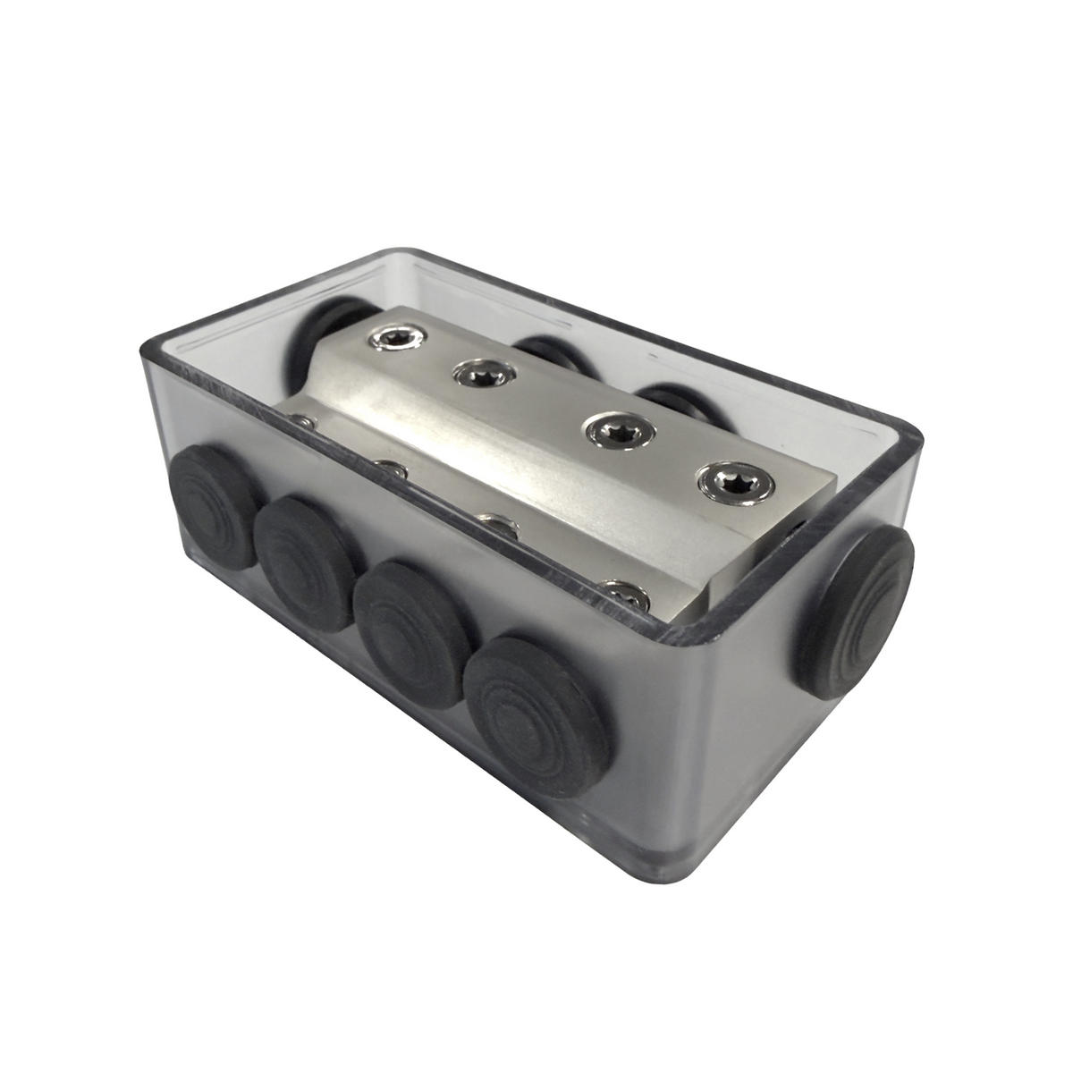 Blocket har fyra ingångar för kablar upp till 50 mm² och fyra utgångar för kablar upp till 25 mm², vilket gör det perfekt som andra steg i en distributionskedja där du behöver förgrena strömmen vidare till flera slutsteg eller komponenter.