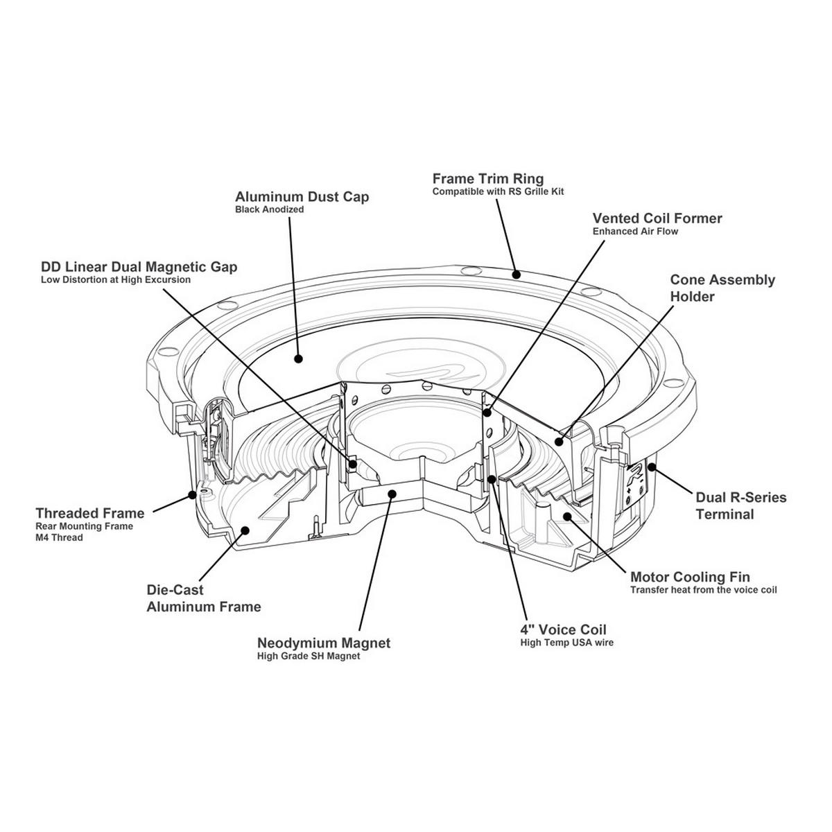 RS-W10D4 är utvecklad helt från grunden för att leverera äkta R-serieprestanda i en grund montering. Hjärtat i konstruktionen är den nya DD Linear Dual Magnetic Gap-tekniken, där två separata magnetgap håller talspolen perfekt linjär även vid långa rörelser. Resultatet är mycket låg distorsion och exceptionell kontroll.