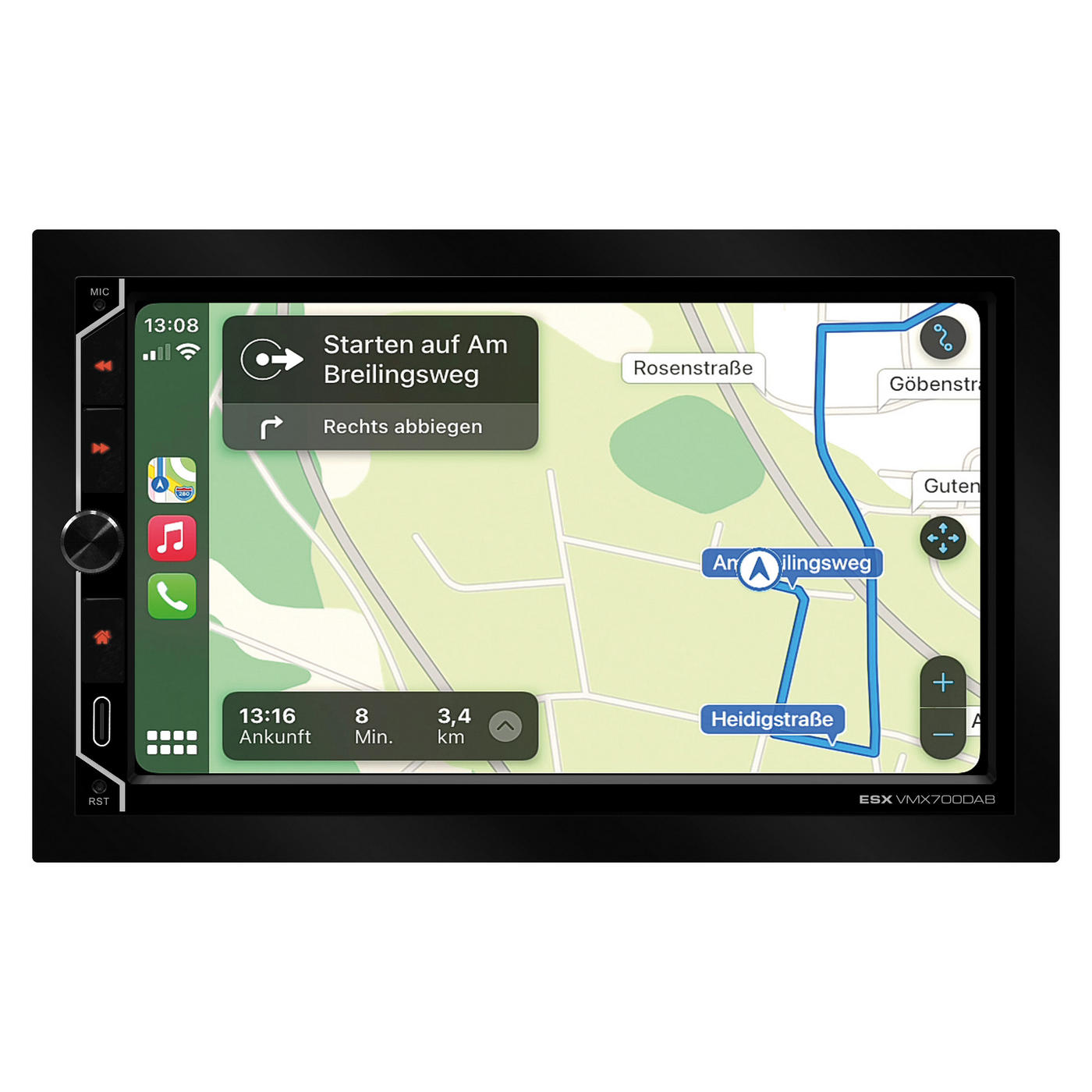 ESX VMX700DAB är fullt kompatibel med Apple CarPlay och Android Auto, både trådlöst och via USB. Njut av säker och intuitiv åtkomst till navigation, telefonsamtal, meddelanden och musik direkt från bilens skärm. Den inbyggda GPS-mottagaren säkerställer optimal positionering för smidig och exakt navigering.